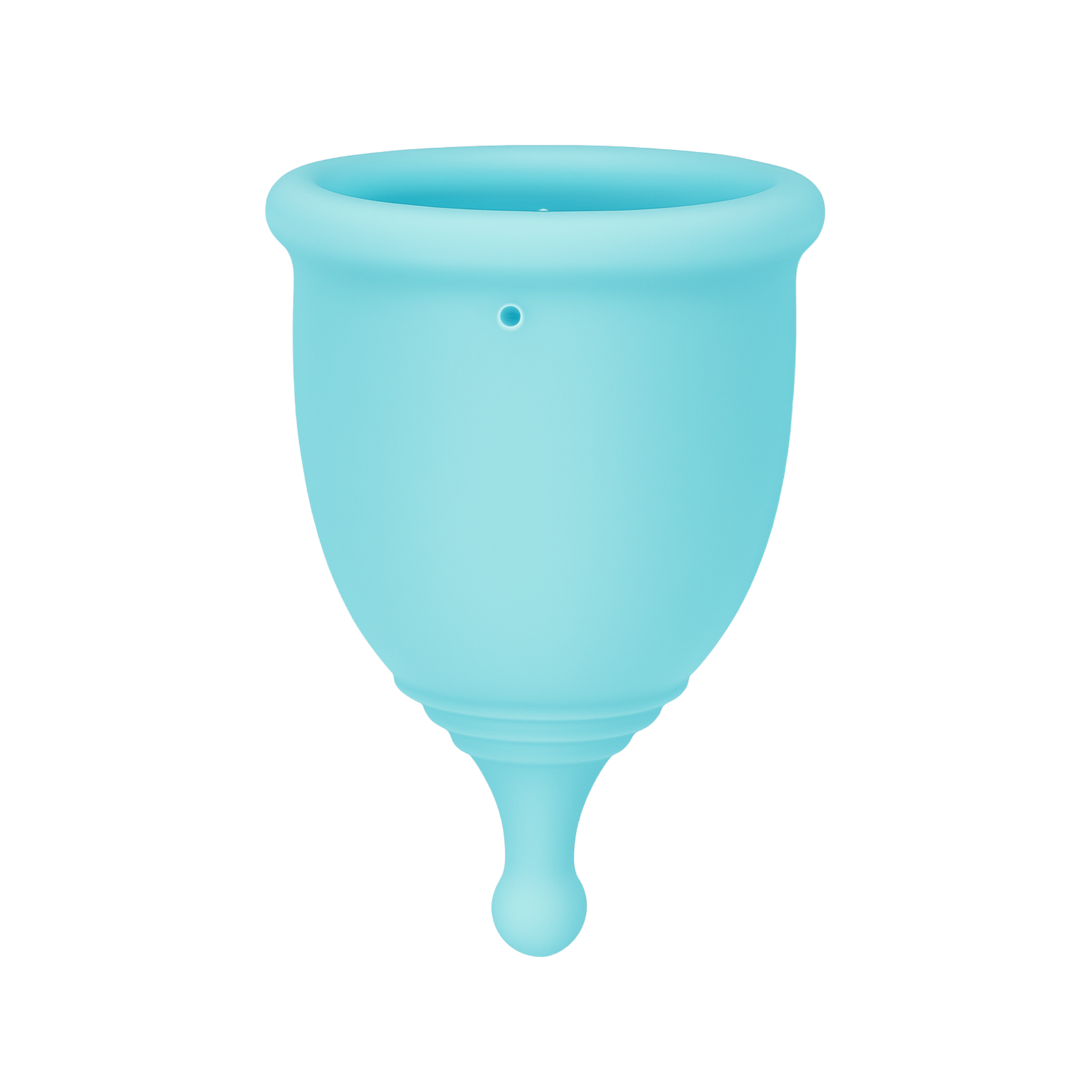 Blå menskopp. Produktet er laget av 100% medisinsk silikon. Den kommer i to forskjellige størrelser. Liten (25 ml) anbefales til de som ikke har født vaginalt. Stor (30 ml) anbefales til de som har født vaginalt. Vær obs på at størrelse er individuelt, og vurder derfor om du behøver å gå opp eller ned en størrelse.